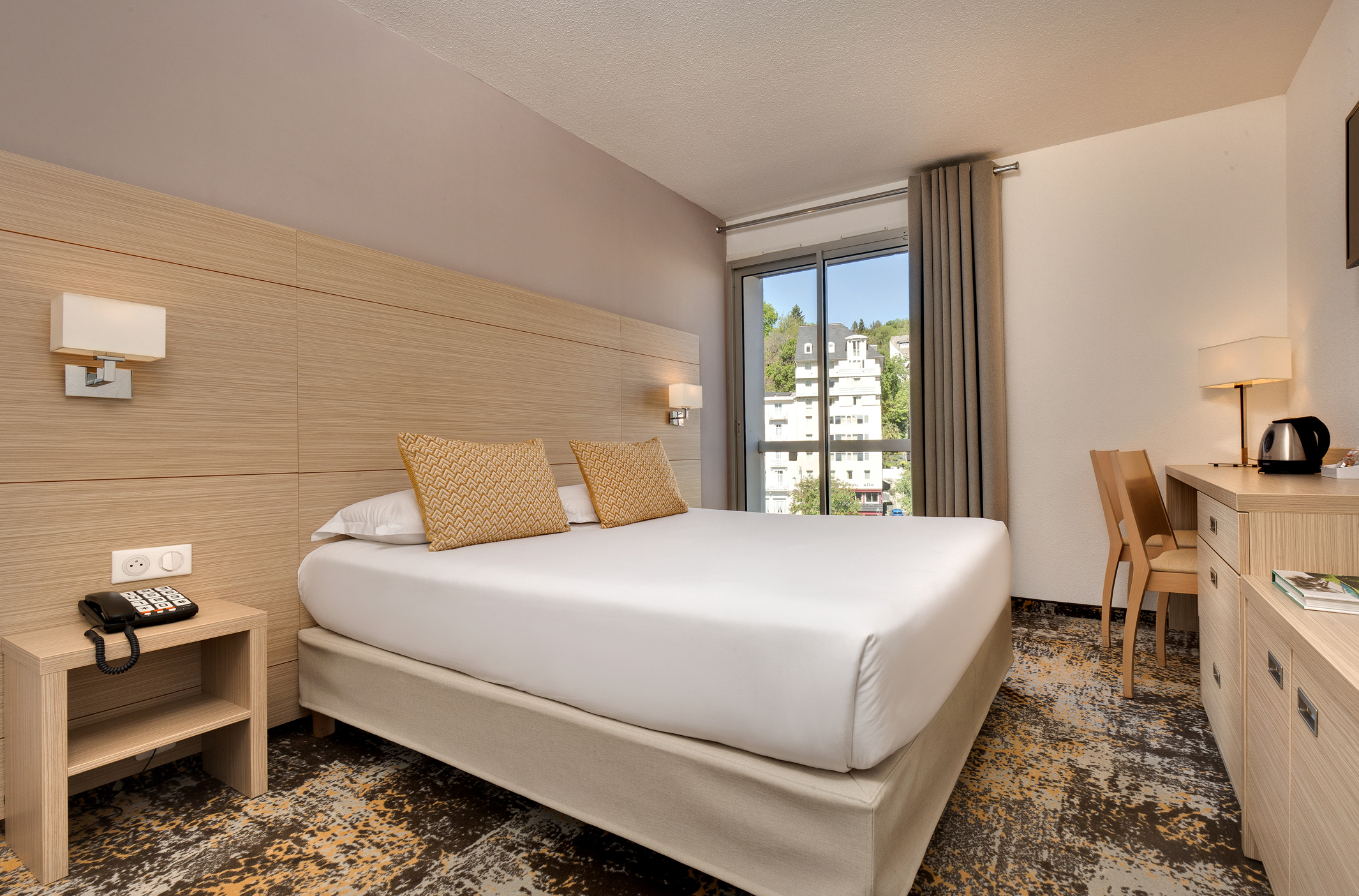 Para su comodidad, pueden elegir entre una cama doble o dos individuales. Algunas de ellas tienen un pequeño balcón privado desde el que se puede disfrutar de la vista de las montañas y del Gave de Pau.